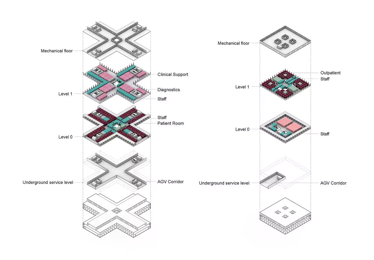 This modular conception of the hospital gives it great flexibility to grow, if required, or even to shrink if necessary. All this with a minimum of disruption to its operation. Moreover, OMA proposes 3D printing technology for its construction, which would allow for endless variations in its ornamentation, in contrast to the usual architecture for this type of building, characterised by austerity.