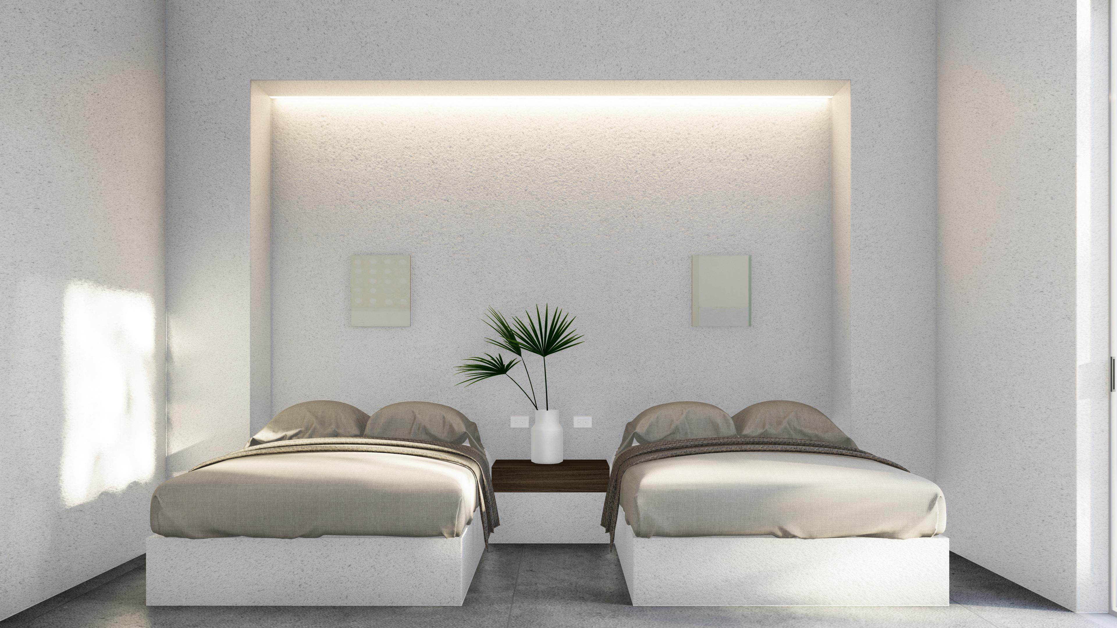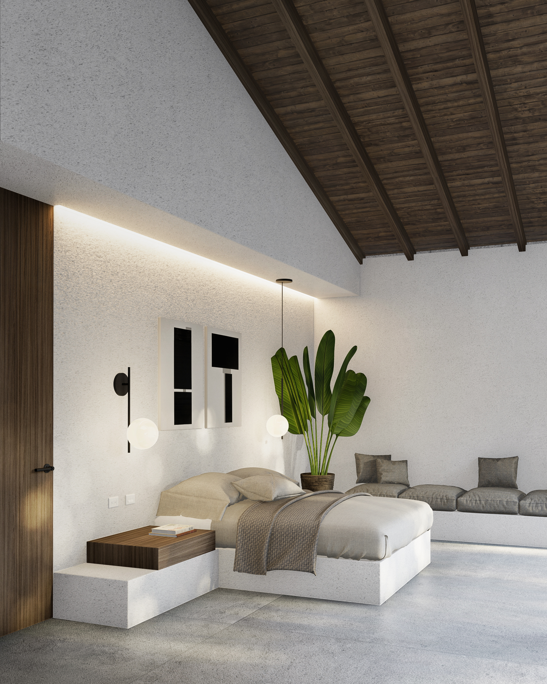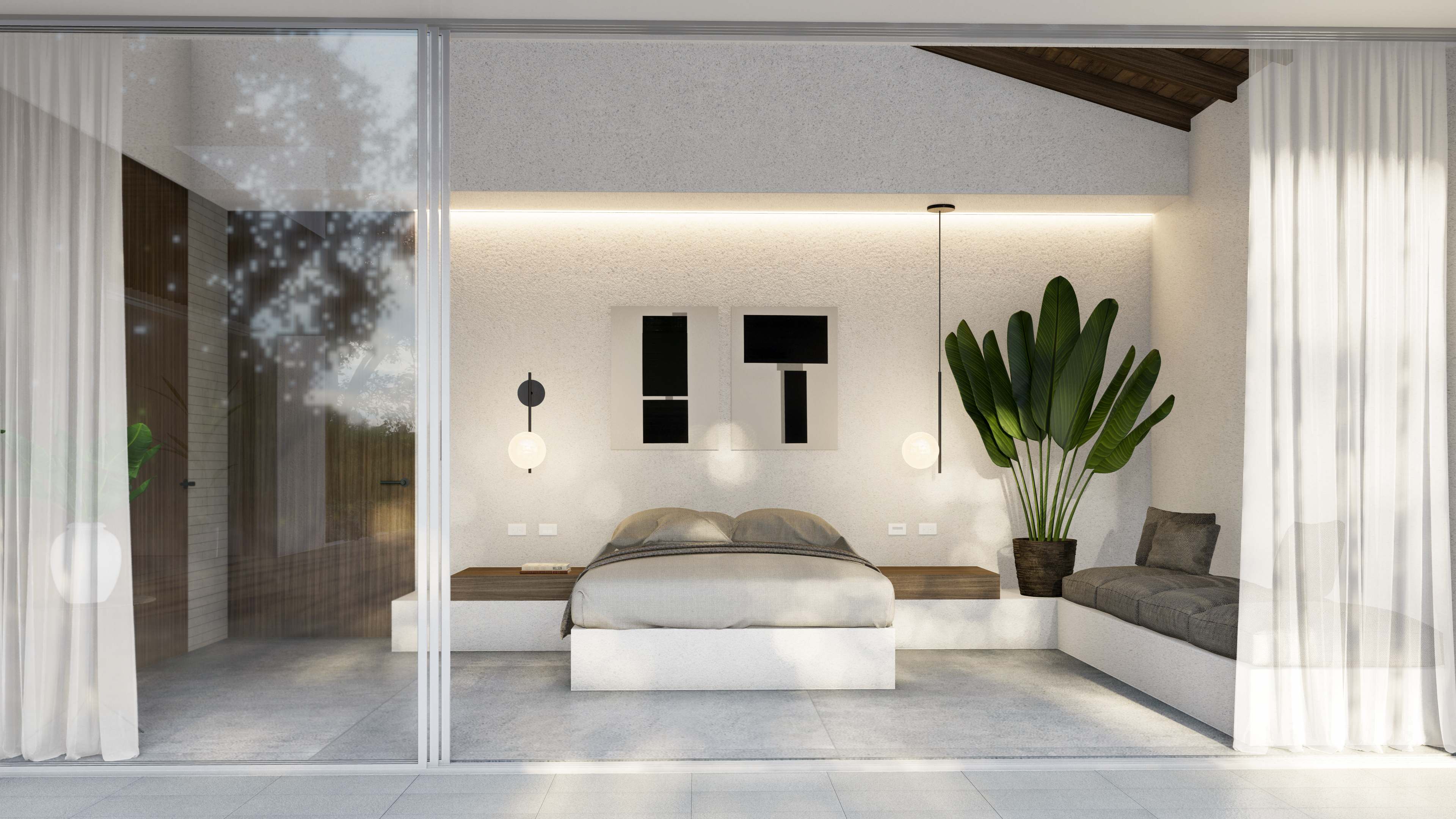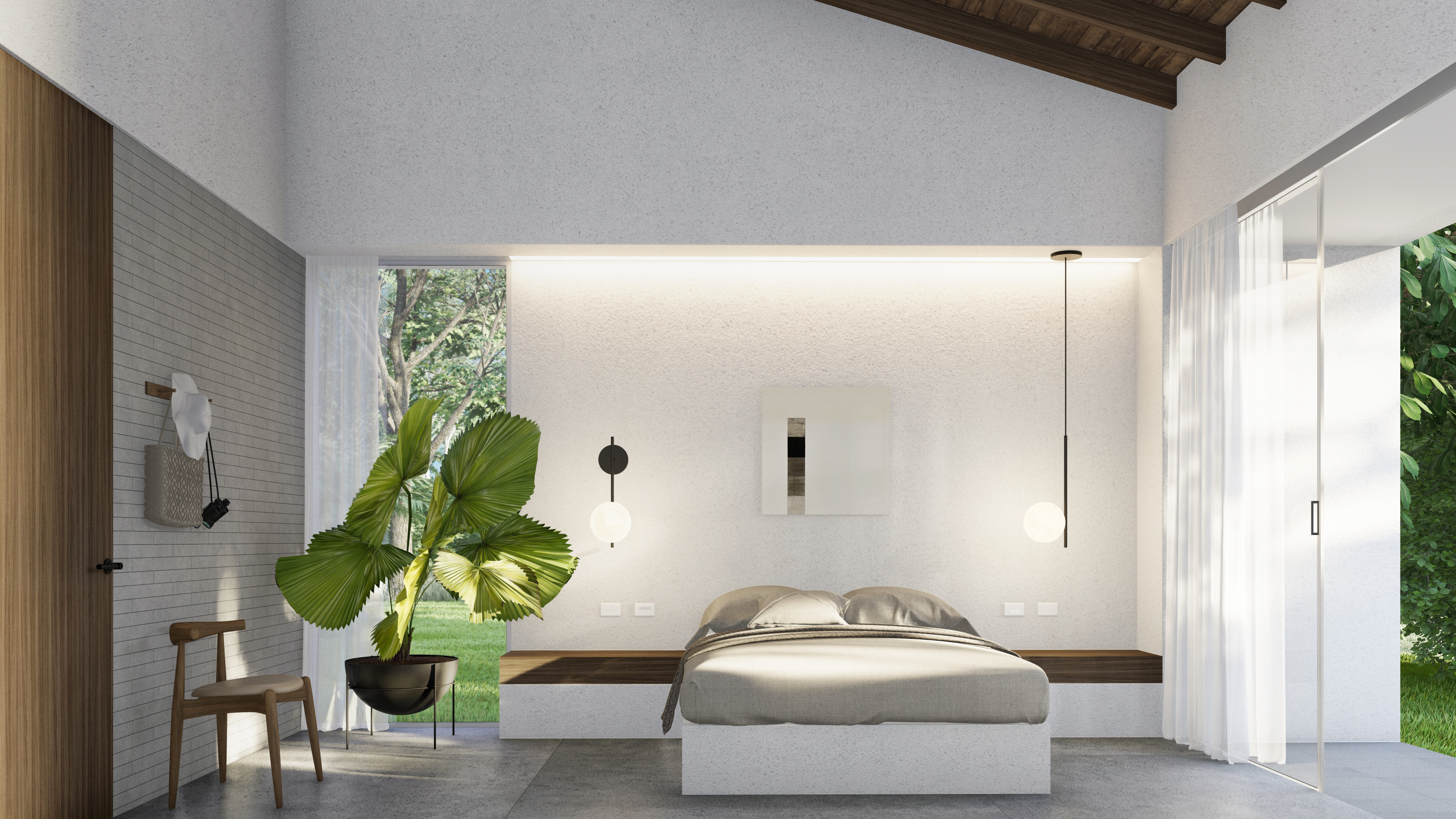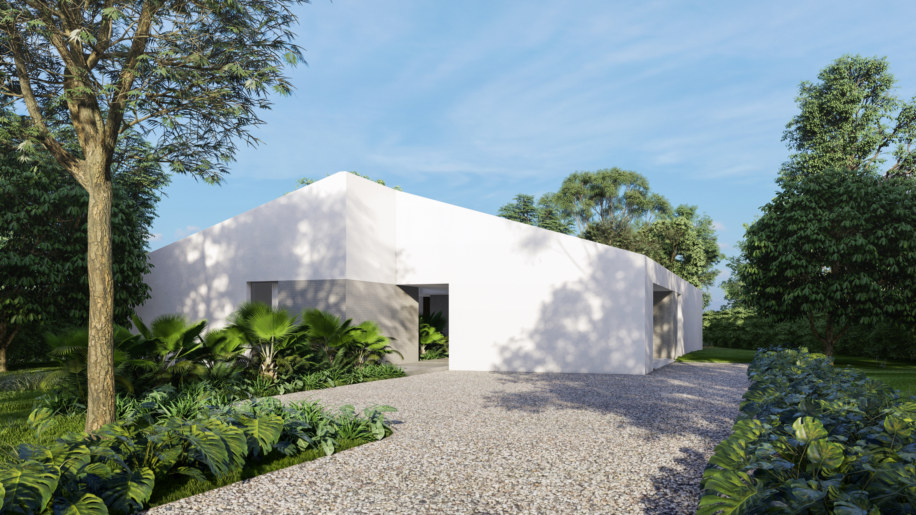 Because the project is located on high ground with beautiful views towards the Abura valley, the main objective of the design was that each space inside the house could have access to them. For this reason, a concept based on two rectangular volumes oriented horizontally towards the visual was designed. Each of them is designed to house groups of spaces with different privacy characteristics. In one, all the social and service areas would be arranged and in the other the private areas, both linked only through a series of circulations around a patio, generated through the overlapping of the two volumes.