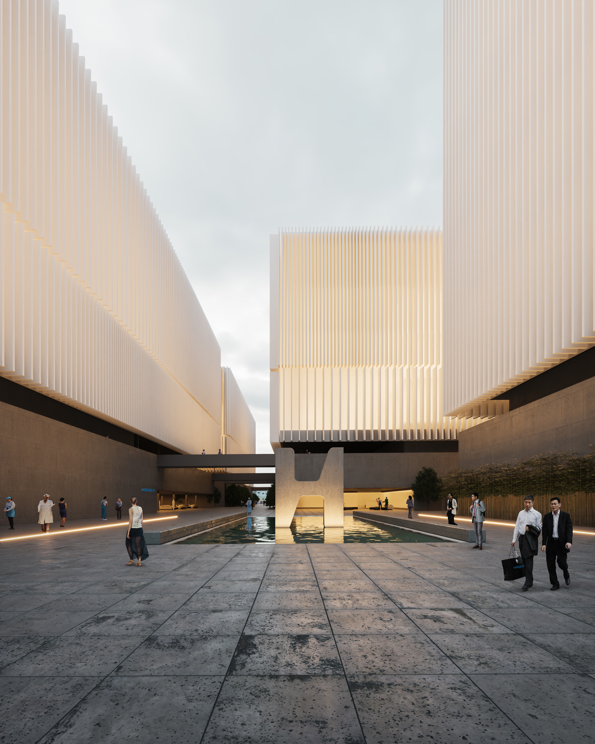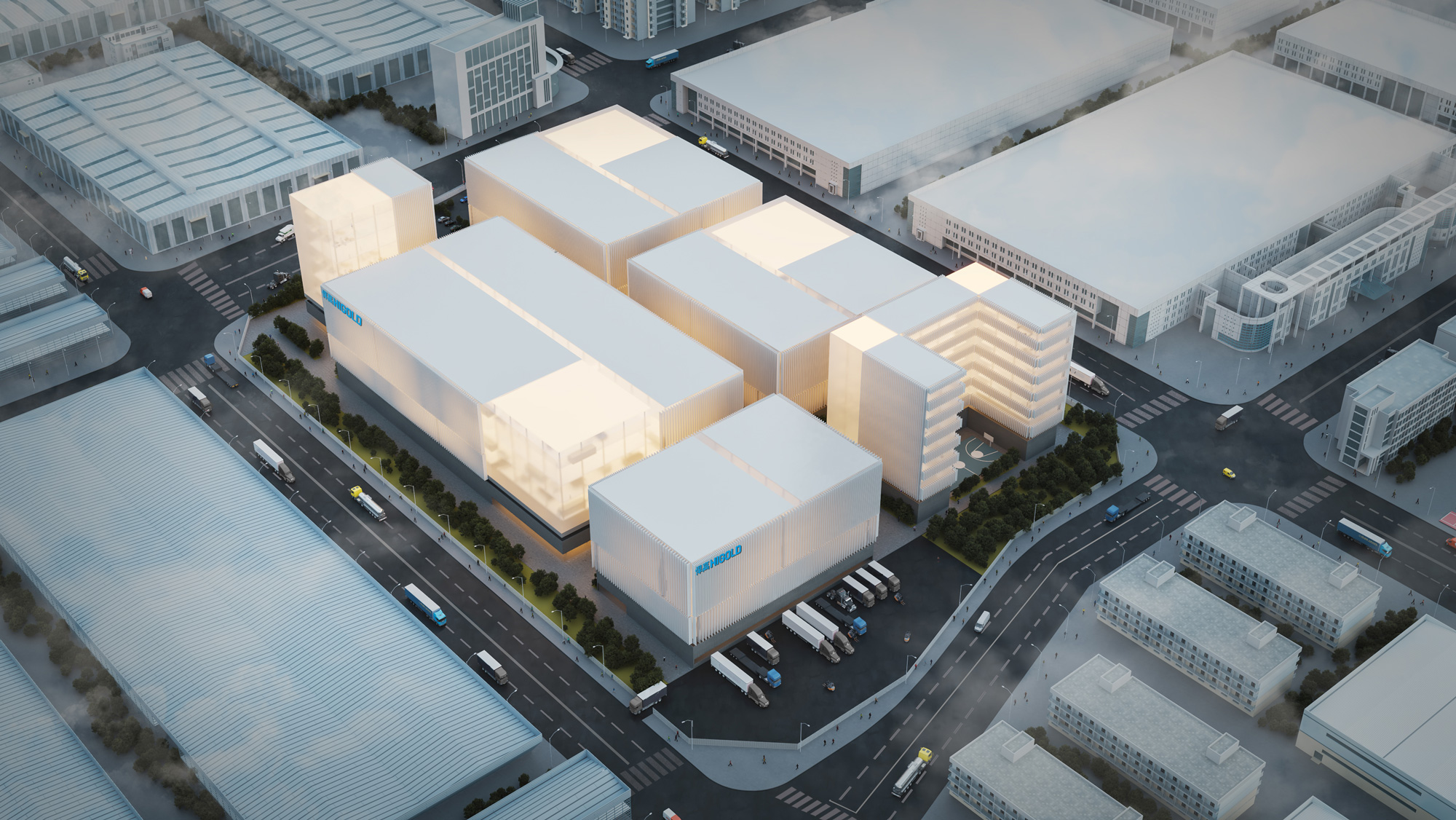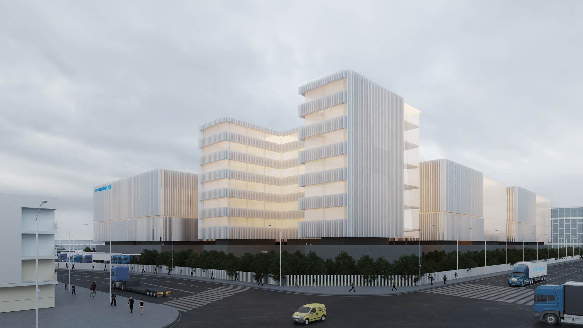 The facades without the metallic profiles use the concept of the “lightbox” and they are made with U-Glass; in these case they correspond to the offices and managing areas. Under every “light cube” the architects subtracted a volume from the podium to make entrances. The new development is going to be a new landmark for the city of Guangdong and an icon for the company brand.