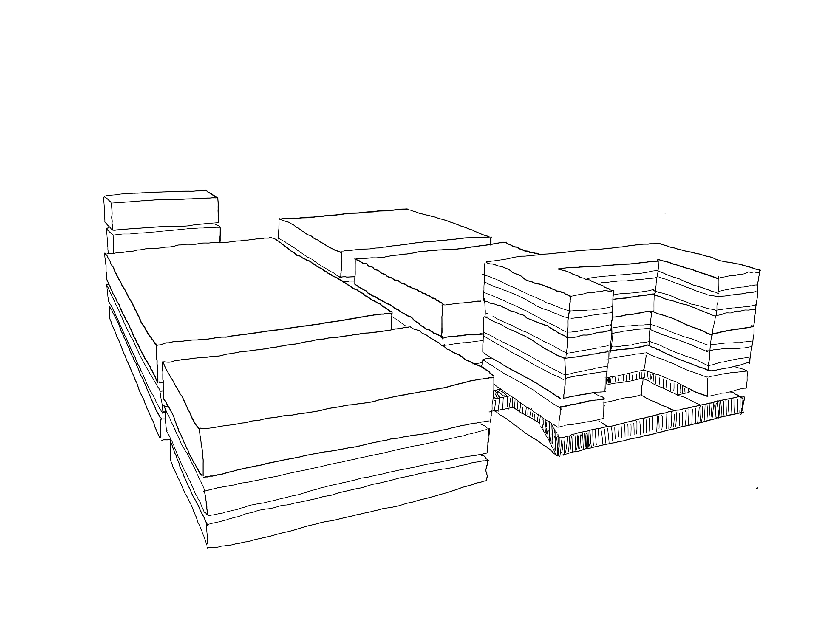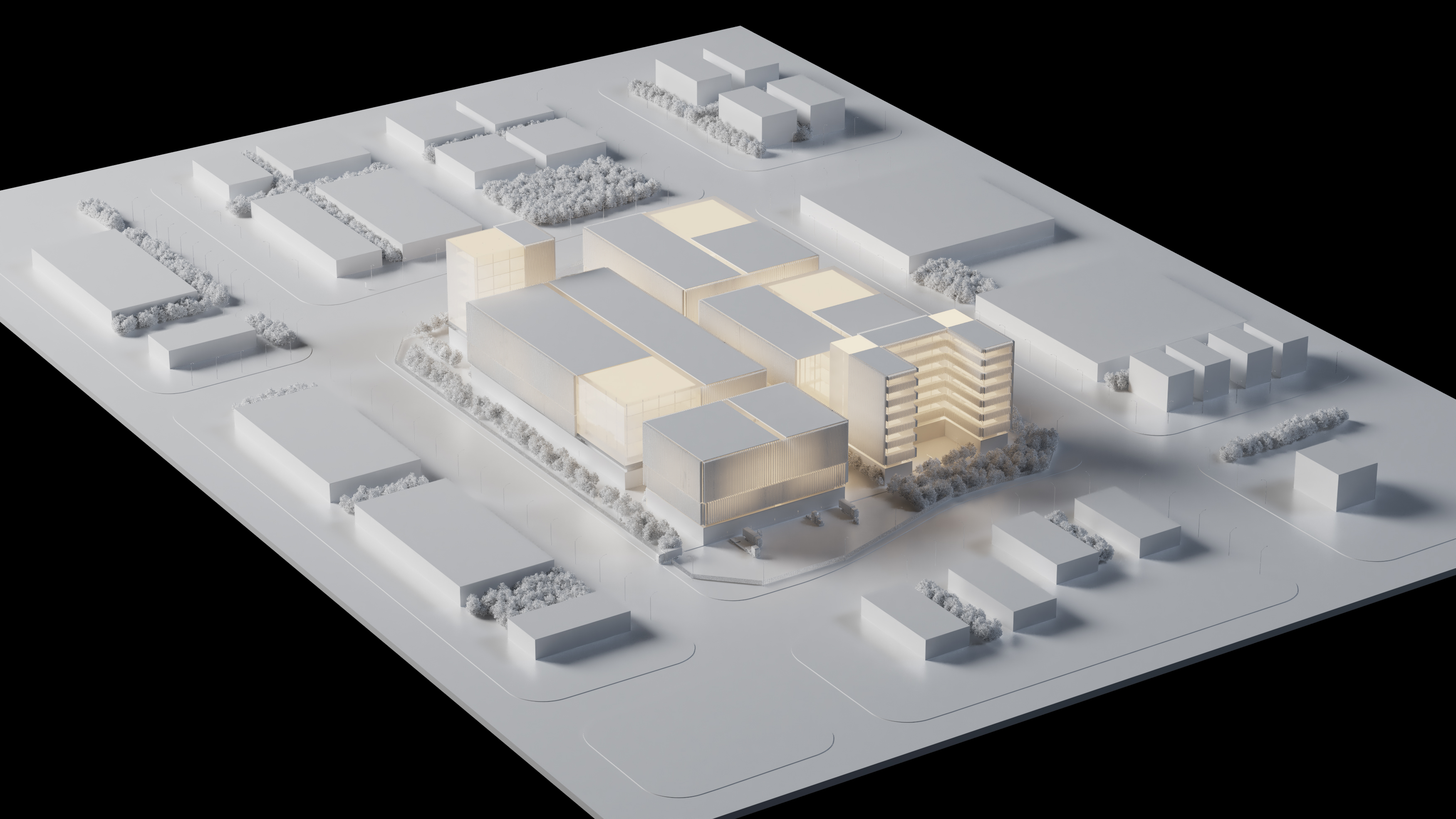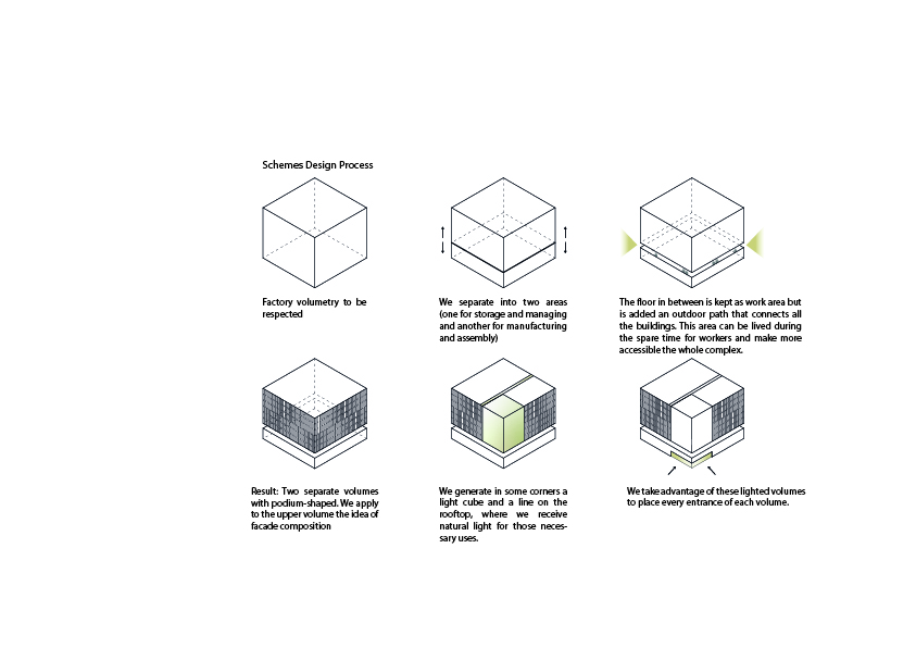 The project consists of the design for a new production base which is going to have among other functions: offices, staff residences and factories buildings. The schemes design process consists in defining clearly the areas of production and the ones for support and management. The whole project stands on a podium that has several shared spaces for the workers and allows the direct connection between the buildings thanks to bridges and ramps.