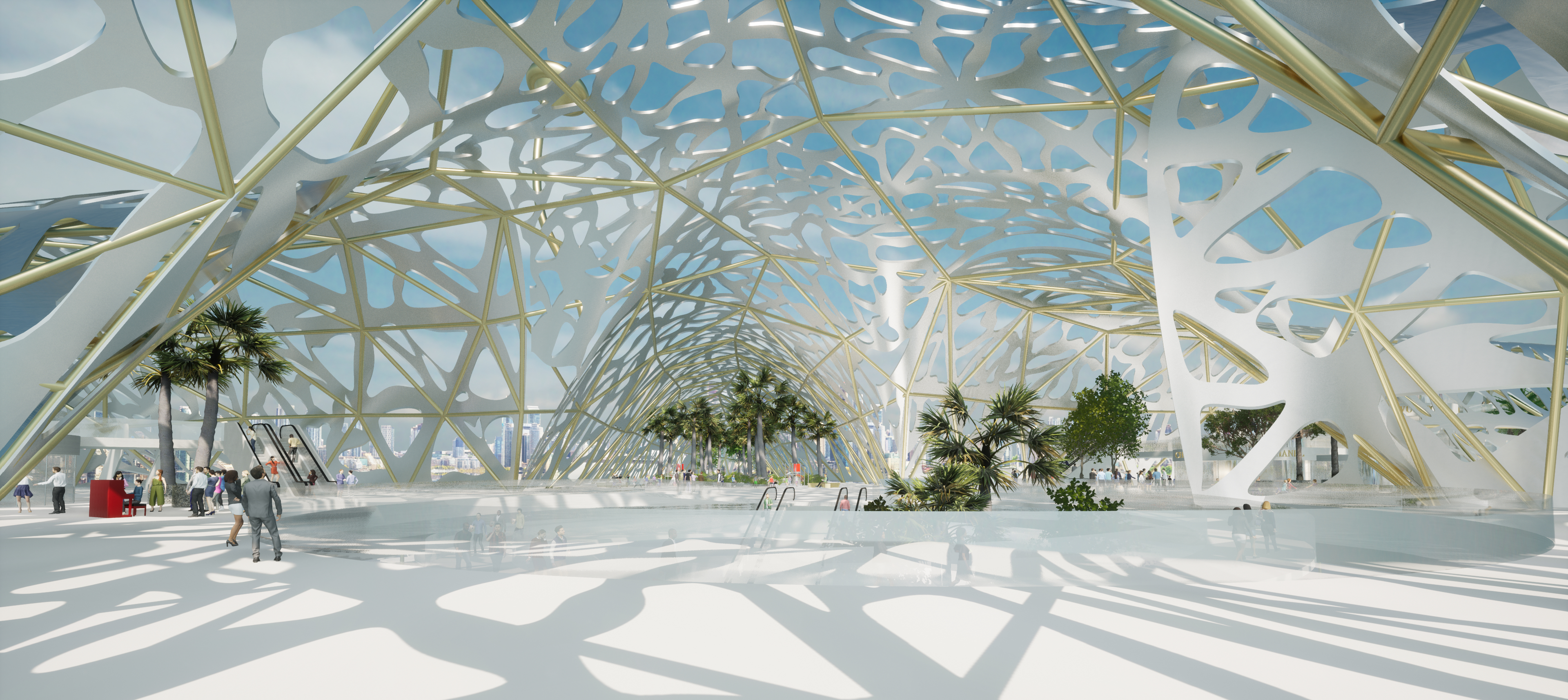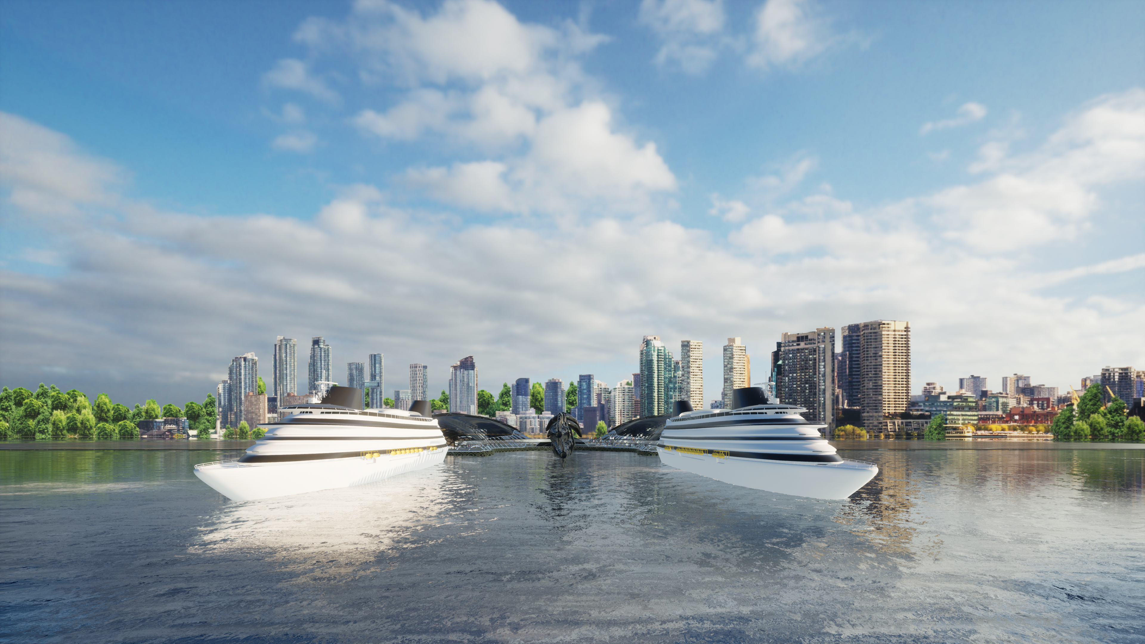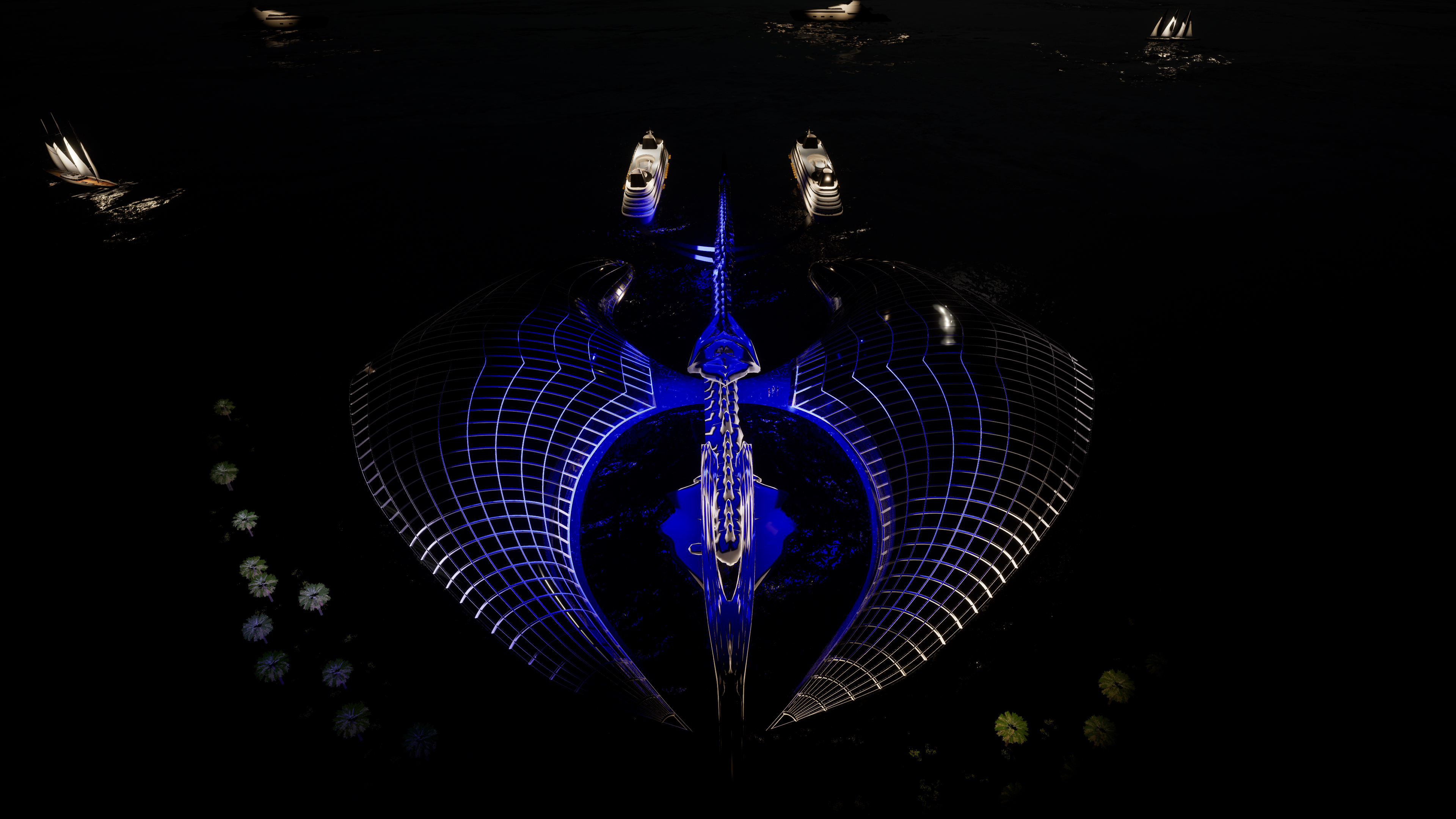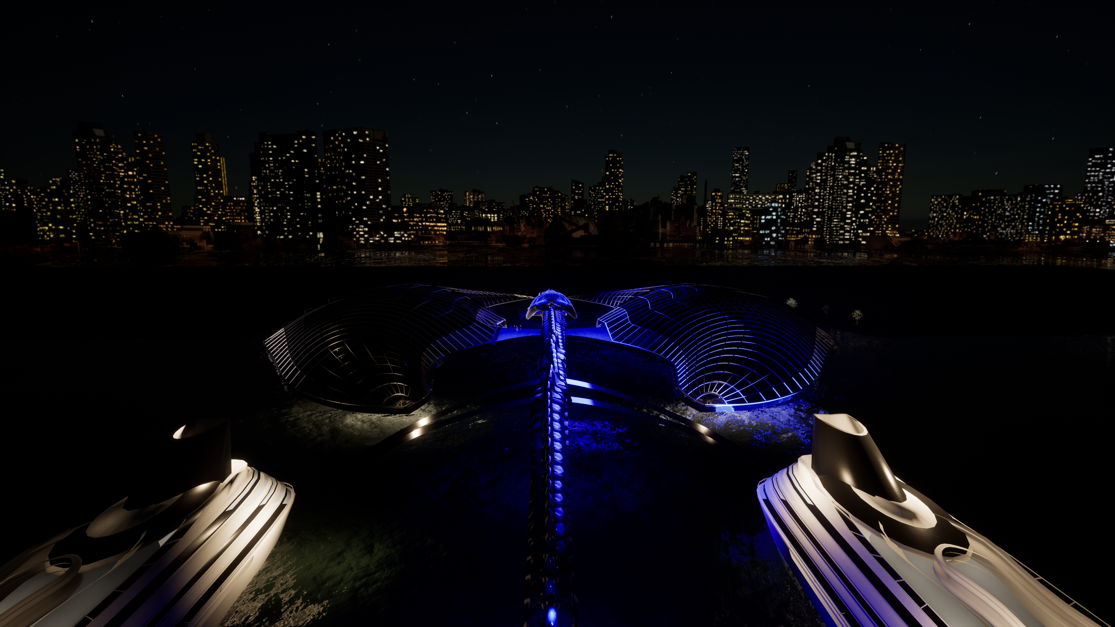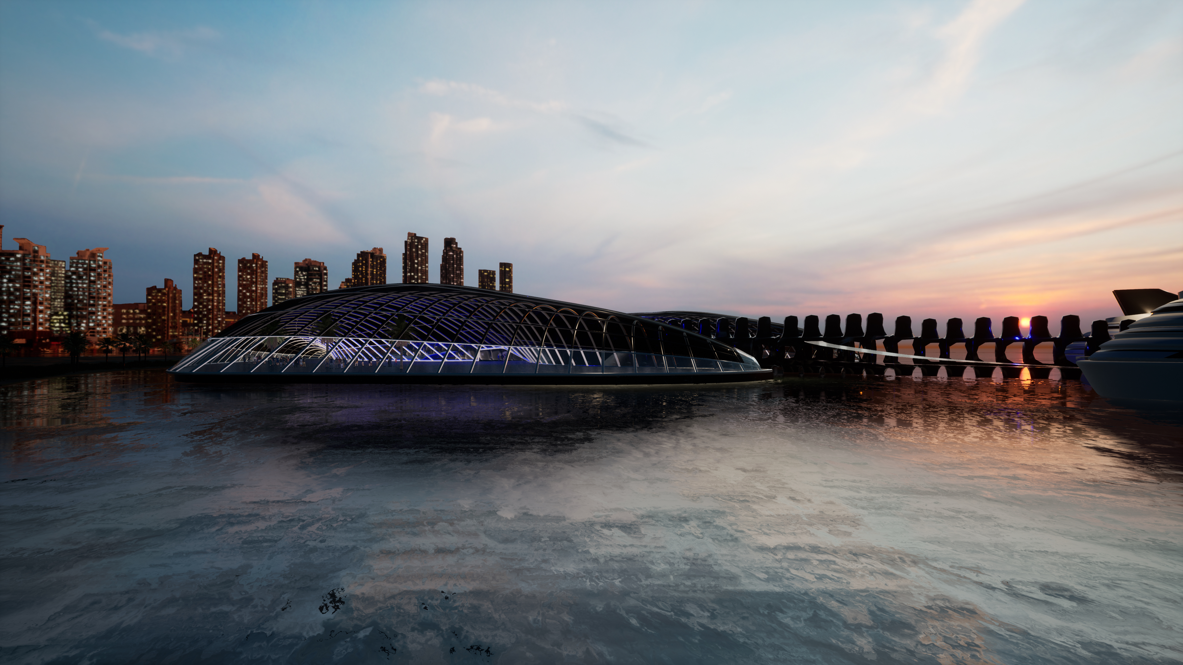 “Lingering Soul” Cruiseship terminal solves the cruise ship industry revolving problem of lack of growth due to limited space as its structure sustains on pillars on the bottom of the sea.  By adding ribs to the manta ray fish layout it can fit up to six large cruiseships.